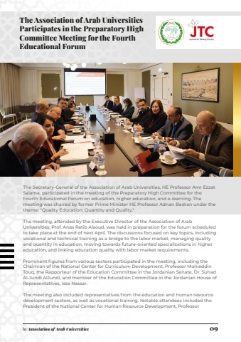 The Secretary-General of the Association of Arab Universities, HE Professor Amr Ezzat Salama, participated in the meeting of the Preparatory High Committee for the Fourth Educational Forum on education, higher education, and e-learning. The meeting was chaired by former Prime Minister HE Professor Adnan Badran under the theme: \The meeting, attended by the Executive Director of the Association of Arab Universities, Prof. Anas Ratib Alsoud, was held in preparation for the forum scheduled to take place at the end of next April. The discussions focused on key topics, including vocational and technical training as a bridge to the labor market, managing quality and quantity in education, moving towards future-oriented specializations in higher education, and linking education quality with labor market requirements.Prominent figures from various sectors participated in the meeting, including the Chairman of the National Center for Curriculum Development, Professor Mohieddin Touq, the Rapporteur of the Education Committee in the Jordanian Senate, Dr. Suhad Al-Jundi AlJundi, and member of the Education Committee in the Jordanian House of Representatives, Issa Nassar.The meeting also included representatives from the education and human resource development sectors, as well as vocational training. Notable attendees included the President of the National Center for Human Resource Development, Professor The Association of Arab Universities Participates in the Preparatory High Committee Meeting for the Fourth Educational Forumby Association of Arab Universities 09