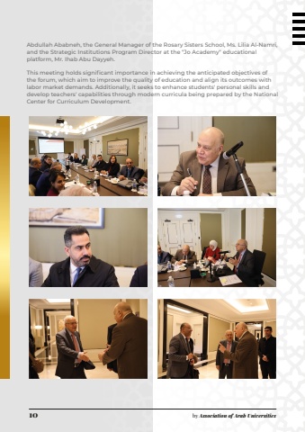 Abdullah Ababneh, the General Manager of the Rosary Sisters School, Ms. Lilia Al-Namri, and the Strategic Institutions Program Director at the \platform, Mr. Ihab Abu Dayyeh.This meeting holds significant importance in achieving the anticipated objectives of the forum, which aim to improve the quality of education and align its outcomes with labor market demands. Additionally, it seeks to enhance students' personal skills and develop teachers' capabilities through modern curricula being prepared by the National Center for Curriculum Development.10 by Association of Arab Universities