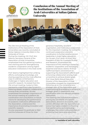 12 by Association of Arab UniversitiesThe 21st Annual Meeting of the Institutions of the Association of Arab Universities was recently concluded at Sultan Qaboos University (SQU) in the Sultanate of Oman.During the meeting, H.E. Prof. Amr Salama, Secretary-General of the Association of Arab Universities, emphasized that this gathering marks a new starting point for strengthening academic cooperation among higher education institutions in the Arab world.Prof. Salama highlighted that unifying efforts, exchanging knowledge, and sharing expertise are the most effective ways to address contemporary challenges in higher education and scientific research. He stated that this 21st annual meeting, hosted at SQU, represents a significant step forward in fostering deeper academic collaboration among Arab universities. He also emphasized the strategic importance of this annual meeting as a platform for coordination and consultation on future visions for developing the performance of academic institutions affiliated with the Association, underscored the importance of promoting innovation and scientific research.He also expressed his gratitude to SQU and the Sultanate of Oman for their generous hospitality, excellent organization, and meticulous preparation for this important meeting. He wished for continued cooperation and joint coordination to further excellence and leadership in Arab higher education.For his part, Prof. Amer Al-Hinai Vice President of SQU for Graduate Studies and Research, emphasized the importance of this meeting in fostering academic cooperation and exchanging expertise and future visions. Al-Hinai reaffirmed SQU%u2019s commitment to supporting the Association%u2019s efforts and enhancing collaboration among Arab universities to achieve shared goals.Prof. Anas Ratib Alsoud Executive Director of the Association of Arab Universities, stressed the importance of following up on the comprehensive strategic plan of the Association and implementing its provisions to achieve its strategic goals in cooperation and coordination with the relevant academic institutions.The meeting also included discussions among the secretaries of scientific associations, directors of councils, and centers affiliated with the Association on several key topics related to enhancing their performance and addressing challenges that some institutions face in achieving their vision and objectives.Conclusion of the Annual Meeting of the Institutions of the Association of Arab Universities at Sultan Qaboos University
