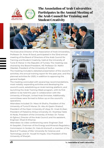 The Executive Director of the Association of Arab Universities, Professor Dr. Anas Al-Saud, participated in the 32nd annual meeting of the Board of Directors of the Arab Council for Training and Student Creativity, held at the University of Tunis El Manar in the Republic of Tunisia. The meeting was chaired by the Board President, HE Professor Dr. Nathir Obeidat, President of the University of Jordan.The meeting included a detailed presentation of the council's activities, the annual training report for the past year, and the planned activities for 2025, in addition to approving the general budget.The meeting concluded with several key recommendations, most notably: expanding activities and developing the council's work, establishing an Arab training platform, and launching the Arab Training Week program, with its first edition to be held this year in collaboration with the University of Sharjah, United Arab Emirates. Additionally, committees were formed to follow up on the council%u2019s operations.Attendees included: Dr. Moez Al-Shafra, President of the University of Tunis El Manar; Dr. Abu Al-Qasim Shalouf, President of the Open University of Libya; Dr. Imad Al-Zeer, President of Palestine Ahliya University; Dr. Mushtaq Taleb Al-Nada, President of the University of Anbar; Dr. Fawaz Al-Zghoul, Director of the Arab Council; and his assistant, Engineer Jihad Al-Kharraz. Attendees via video conferencing were: Engineer Ziad Al-Saaydeh, Chairman of the Energy and Minerals Regulatory Commission in Jordan; Dr. Hala Al-Munoufi, a member of the Board of Trustees of Misr University for Science and Technology; and Dr. Yousef Al-Hayek, Vice President of the University of Sharjah.18 by Association of Arab UniversitiesThe Association of Arab Universities Participates in the Annual Meeting of the Arab Council for Training and Student Creativity