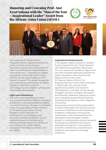 by Association of Arab Universities 19The Concorde El Salam Hotel in Heliopolis hosted a grand ceremony to honor Prof. Amr Ezzat Salama, Secretary-General of the Association of Arab Universities, with the prestigious \award from the African-Asian Union (AFASU), under the presidency of Dr. Hossam Darwish. The award recognizes his outstanding contributions to higher education, scientific research, technology, tourism, health, culture, and sustainable development.High-Level AttendanceThe event was attended by an elite group of distinguished figures, including academics, university presidents, deans, current and former ministers. It was held under the patronage of Major General Dr. Khaled Fouda, Advisor to the President of the Republic for Development and Heritage, and honorary president of AFASU. Also in attendance was His Excellency Dr. Mohamed Awad Tag El-Din, Advisor to the President for Health Affairs, alongside media figures, writers, and journalists.Inspirational AchievementsIn his speech, Major General Dr. Khaled Fouda praised Prof. Amr Ezzat Salama%u2019s well-deserved recognition, describing him as a prominent academic figure who has held multiple leadership positions in higher education institutions across Egypt and the Arab world.Dr. Salama holds a PhD in Civil Engineering from Heriot-Watt University in Edinburgh, UK, and has made significant scientific and research contributions in his field. He has served as Egypt%u2019s Minister of Higher Education and Scientific Research, playing a crucial role in developing educational policies and advancing research within Egyptian universities.As Secretary-General of the Association of Arab Universities, Prof. Salama has led numerous initiatives aimed at fostering academic cooperation among Arab universities. Under his leadership, the association has witnessed notable growth in membership and joint projects, including the establishment of joint educational programs, international scientific conferences, and enhanced academic and research exchange programs.Honoring and Crowning Prof. Amr Ezzat Salama with the \%u2013 Inspirational Leader\the African-Asian Union (AFASU)