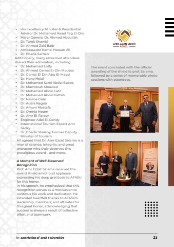 by Association of Arab Universities 21The event concluded with the official awarding of the shield to prof. Salama, followed by a series of memorable photo sessions with attendees.His Excellency Minister & Presidential Advisor Dr. Mohamed Awad Tag El-DinMajor General Dr. Ahmed AbdullahDr. Tarek ShawkiDr. Ahmed Zaki BadrAmbassador Kamal Hassan AliDr. Ebada SarhanAdditionally, many esteemed attendees shared their admiration, including:Dr. Mohamed LotfyDr. Ahmed Gamal El-Din MoussaDr. Gamal El-Din Abu El-MagdDr. Hany HelalDr. Mohamed Sami Abdel SadeqDr. Mamdouh MoawadDr. Mohamed Abdel LatifDr. Mohamed Abdel FattahDr. Nevine GalalDr. Adela RagabDr. Amani MostafaDr. Omnia NegmDr. Amr El-FarasyEngineer Adel El-GendyInternational Tourism Expert Amr SedkyDr. Ghada Shalaby, Former Deputy Minister of TourismAll agreed that Dr. Amr Ezzat Salama is a man of science, integrity, and great character who truly deserves this prestigious award%u2014and more.A Moment of Well-Deserved RecognitionProf. Amr Ezzat Salama received the award shield amid loud applause, expressing his deep gratitude to AFASU for this honor.In his speech, he emphasized that this recognition serves as a motivation to continue his work and dedication. He extended heartfelt thanks to AFASU%u2019s leadership, members, and affiliates for this great honor, acknowledging that success is always a result of collective effort and teamwork.%u2022 %u2022 %u2022 %u2022 %u2022 %u2022%u2022%u2022%u2022%u2022%u2022%u2022%u2022%u2022%u2022%u2022%u2022%u2022%u2022%u2022%u2022%u2022