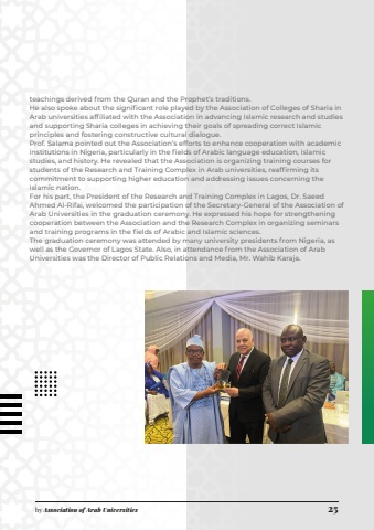 by Association of Arab Universities 25teachings derived from the Quran and the Prophet%u2019s traditions.He also spoke about the significant role played by the Association of Colleges of Sharia in Arab universities affiliated with the Association in advancing Islamic research and studies and supporting Sharia colleges in achieving their goals of spreading correct Islamic principles and fostering constructive cultural dialogue.Prof. Salama pointed out the Association%u2019s efforts to enhance cooperation with academic institutions in Nigeria, particularly in the fields of Arabic language education, Islamic studies, and history. He revealed that the Association is organizing training courses for students of the Research and Training Complex in Arab universities, reaffirming its commitment to supporting higher education and addressing issues concerning the Islamic nation.For his part, the President of the Research and Training Complex in Lagos, Dr. Saeed Ahmed Al-Rifai, welcomed the participation of the Secretary-General of the Association of Arab Universities in the graduation ceremony. He expressed his hope for strengthening cooperation between the Association and the Research Complex in organizing seminars and training programs in the fields of Arabic and Islamic sciences.The graduation ceremony was attended by many university presidents from Nigeria, as well as the Governor of Lagos State. Also, in attendance from the Association of Arab Universities was the Director of Public Relations and Media, Mr. Wahib Karaja.