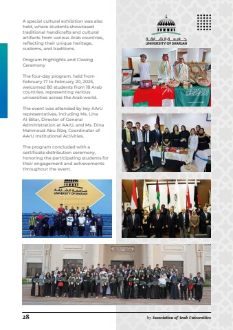 28 by Association of Arab UniversitiesA special cultural exhibition was also held, where students showcased traditional handicrafts and cultural artifacts from various Arab countries, reflecting their unique heritage, customs, and traditions.Program Highlights and Closing CeremonyThe four-day program, held from February 17 to February 20, 2025, welcomed 80 students from 18 Arab countries, representing various universities across the Arab world.The event was attended by key AArU representatives, including Ms. Lina Al-Bitar, Director of General Administration at AArU, and Ms. Dina Mahmoud Abu Rizq, Coordinator of AArU Institutional Activities.The program concluded with a certificate distribution ceremony, honoring the participating students for their engagement and achievements throughout the event.