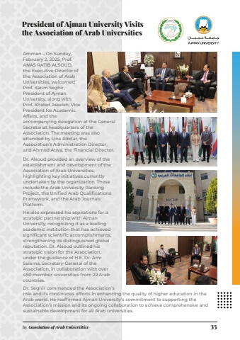 Amman %u2013 On Sunday, February 2, 2025, Prof. ANAS RATIB ALSOUD, the Executive Director of the Association of Arab Universities, welcomed Prof. Karim Seghir, President of Ajman University, along with Prof. Khaled Assaleh, Vice President for Academic Affairs, and the accompanying delegation at the General Secretariat headquarters of the Association. The meeting was also attended by Lina Albitar, the Association%u2019s Administration Director, and Ahmed Atwa, the Financial Director.Dr. Alsoud provided an overview of the establishment and development of the Association of Arab Universities, highlighting key initiatives currently undertaken by the organization. These include the Arab University Ranking Project, the Unified Arab Qualifications Framework, and the Arab Journals Platform.He also expressed his aspirations for a strategic partnership with Ajman University, recognizing it as a leading academic institution that has achieved significant scientific accomplishments, strengthening its distinguished global reputation. Dr. Alsoud outlined his strategic vision for the Association, under the guidance of H.E. Dr. Amr Salama, Secretary-General of the Association, in collaboration with over 450 member universities from 22 Arab countries.Dr. Seghir commended the Association%u2019s role and its continuous efforts in enhancing the quality of higher education in the Arab world. He reaffirmed Ajman University%u2019s commitment to supporting the Association%u2019s mission and its ongoing collaboration to achieve comprehensive and sustainable development for all Arab universities.President of Ajman University Visits the Association of Arab Universitiesby Association of Arab Universities 35