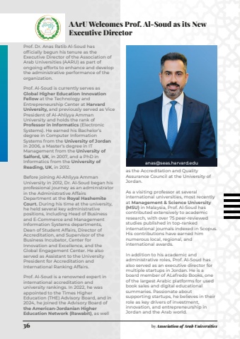 Prof. Dr. Anas Ratib Al-Soud has officially begun his tenure as the Executive Director of the Association of Arab Universities (AARU) as part of ongoing efforts to enhance and develop the administrative performance of the organization.Prof. Al-Soud is currently serves as Global Higher Education Innovation Fellow at the Technology and Entrepreneurship Center at Harvard University, and previously served as Vice President of Al-Ahliyya Amman University and holds the rank of Professor in Informatics (Electronic Systems). He earned his Bachelor%u2019s degree in Computer Information Systems from the University of Jordanin 2006, a Master%u2019s degree in IT Management from the University of Salford, UK, in 2007, and a PhD in Informatics from the University of Reading, UK, in 2012.Before joining Al-Ahliyya Amman University in 2012, Dr. Al-Soud began his professional journey as an administrator in the Administrative Affairs Department at the Royal Hashemite Court. During his time at the university, he held several key administrative positions, including Head of Business and E-Commerce and Management Information Systems departments, Dean of Student Affairs, Director of Accreditation, and Supervisor of the Business Incubator, Center for Innovation and Excellence, and the Global Engagement Center. He also served as Assistant to the University President for Accreditation and International Ranking Affairs.Prof. Al-Soud is a renowned expert in international accreditation and university rankings. In 2022, he was appointed to the Times Higher Education (THE) Advisory Board, and in 2024, he joined the Advisory Board of the American-Jordanian Higher Education Network (Rawabit), as well as the Accreditation and Quality Assurance Council at the University of Jordan.As a visiting professor at several international universities, most recently at Management & Science University (MSU) in Malaysia, Prof. Al-Soud has contributed extensively to academic research, with over 75 peer-reviewed studies published in top-ranked international journals indexed in Scopus. His contributions have earned him numerous local, regional, and international awards.In addition to his academic and administrative roles, Prof. Al-Soud has also served as an executive director for multiple startups in Jordan. He is a board member of ALefredo Books, one of the largest Arabic platforms for used book sales and digital educational summaries. Passionate about supporting startups, he believes in their role as key drivers of investment, innovation, and entrepreneurship in Jordan and the Arab world.36 by Association of Arab UniversitiesAArU Welcomes Prof. Al-Soud as its New Executive Directoranas@seas.harvard.edu