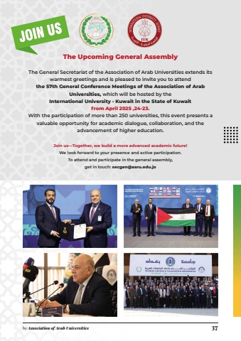by Association of Arab Universities 37The Upcoming General AssemblyThe General Secretariat of the Association of Arab Universities extends its warmest greetings and is pleased to invite you to attendthe 57th General Conference Meetings of the Association of Arab Universities, which will be hosted by theInternational University - Kuwait in the State of Kuwaitfrom April 2025 ,24-23.With the participation of more than 250 universities, this event presents a valuable opportunity for academic dialogue, collaboration, and the advancement of higher education.Join us%u2014Together, we build a more advanced academic future!We look forward to your presence and active participation.To attend and participate in the general assembly,get in touch: secgen@aaru.edu.jo
