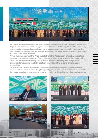His Royal Highness Prince Turki bin Talal bin Abdulaziz Al Saud, Governor of the Asir Region and Chairman of the Regional Development Authority, Hosted the honoring ceremony for universities participating in the second Arab university ranking. The event was attended by the Secretary-General of the Association of Arab Universities, H.E. Prof. Amr Ezzat Salama.Prince Turki welcomed the Arab guests from the Association of Arab Universities, emphasizing the importance of recognizing academic excellence. He praised King Saud University for achieving first place in the Arab ranking and King Khalid University for securing the fifth position overall and the second among Saudi universities.Dr. Amr Ezzat Salama, Secretary-General of the Association of Arab Universities, expressed his honor in attending this prestigious event, which celebrates universities that have excelled in the second Arab university ranking. The ranking was launched 04 by Association of Arab Universities
