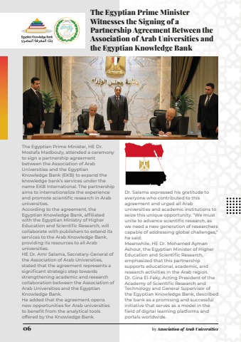 06 by Association of Arab UniversitiesThe Egyptian Prime Minister, HE Dr. Mostafa Madbouly, attended a ceremony to sign a partnership agreement between the Association of Arab Universities and the Egyptian Knowledge Bank (EKB) to expand the knowledge bank%u2019s services under the name EKB International. The partnership aims to internationalize the experience and promote scientific research in Arab universities.According to the agreement, the Egyptian Knowledge Bank, affiliated with the Egyptian Ministry of Higher Education and Scientific Research, will collaborate with publishers to extend its services to the Arab Knowledge Bank, providing its resources to all Arab universities.HE Dr. Amr Salama, Secretary-General of the Association of Arab Universities, stated that the agreement represents a significant strategic step towards strengthening academic and research collaboration between the Association of Arab Universities and the Egyptian Knowledge Bank.He added that the agreement opens new opportunities for Arab universities to benefit from the analytical tools offered by the Knowledge Bank.Dr. Salama expressed his gratitude to everyone who contributed to this agreement and urged all Arab universities and academic institutions to seize this unique opportunity. %unite to advance scientific research, as we need a new generation of researchers capable of addressing global challenges,\he said.Meanwhile, HE Dr. Mohamed Ayman Ashour, the Egyptian Minister of Higher Education and Scientific Research, emphasized that this partnership supports educational, academic, and research activities in the Arab region.Dr. Gina El-Feky, Acting President of the Academy of Scientific Research and Technology and General Supervisor of the Egyptian Knowledge Bank, described the bank as a promising and successful initiative that serves as a model in the field of digital learning platforms and portals worldwide.The Egyptian Prime Minister Witnesses the Signing of a Partnership Agreement Between the Association of Arab Universities and the Egyptian Knowledge Bank