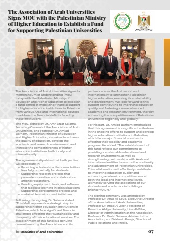 The Association of Arab Universities Signs MOU with the Palestinian Ministry of Higher Education to Establish a Fund for Supporting Palestinian UniversitiesThe Association of Arab Universities signed a Memorandum of Understanding (MoU) today with the Palestinian Ministry of Education and Higher Education to establish a fund aimed at mobilizing financial support for higher education institutions in Palestine from various Arab and international sources to address the financial deficits faced by these institutions.The MoU, signed by Dr. Amr Ezzat Salama, Secretary-General of the Association of Arab Universities, and Professor Dr. Amjad Barham, Palestinian Minister of Education and Higher Education, also aims to enhance the quality of education, develop the academic and research environment, and increase the competitiveness of higher education institutions both locally and internationally.The agreement stipulates that both parties will cooperate in:Providing scholarships that cover tuition fees fully or partially for students.Supporting research projects that promote innovation and collaboration among researchers.Funding equipment, tools, and software that facilitate learning in crisis situations.Supporting development projects and sustainable environment initiatives.Following the signing, Dr. Salama stated: %u201cThis MoU represents a strategic step in supporting higher education institutions in Palestine, which face significant financial challenges affecting their sustainability and the quality of their educational services. The establishment of this fund is a genuine commitment by the Association and its partners across the Arab world and internationally to strengthen Palestinian higher education, ensuring its sustainability and development. We look forward to this support contributing to improving education quality and fostering a more advanced academic and research environment, thereby enhancing the competitiveness of Palestinian universities regionally and globally.%u201dFor his part, Dr. Amjad Barham emphasized that this agreement is a significant milestone in the ongoing efforts to support and develop higher education institutions in Palestine, which face major financial constraints affecting their stability and academic progress. He added: %u201cThe establishment of this fund reflects our commitment to providing a sustainable educational and research environment, as well as strengthening partnerships with Arab and international entities to ensure the continuity and advancement of Palestinian universities. This collaboration will effectively contribute to improving education quality and enhancing academic competitiveness at both the local and international levels, ultimately serving the aspirations of our students and academics in building a brighter future.%u201dThe signing ceremony was attended by Professor Dr. Anas Al-Soud, Executive Director of the Association of Arab Universities, Professor Dr. Imad Al-Zeer, President of Palestine Ahliya University, Lina Al-Bitar, Director of Administration at the Association, Professor Dr. Walid Salama, Adviser to the Association, and Waheeb Karaja, Director of Public Relations and Media.%u2022 %u2022 %u2022 %u2022 by Association of Arab Universities 07