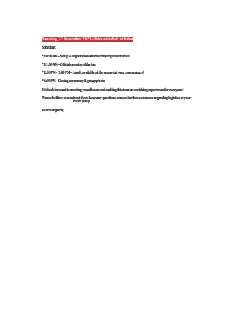 Saturday,22November2025%u2013EducationFairinRabatSchedule:*10:00AM%u2013Setup®istrationofuniversityrepresentatives*11:00AM%u2013Oficialopeningofthefair*1:00PM%u20133:00PM%u2013Lunchavailableatthevenue(atyourconvenience)*6:00PM%u2013Closingceremony&groupphotoWelookforwardtomeetingyouallsoonandmakingthistouranenrichingexperienceforeveryone!Pleasefeelfreetoreachoutifyouhaveanyquestionsorneedfurtherassistanceregardinglogisticsoryour boothsetup.Warmregards,