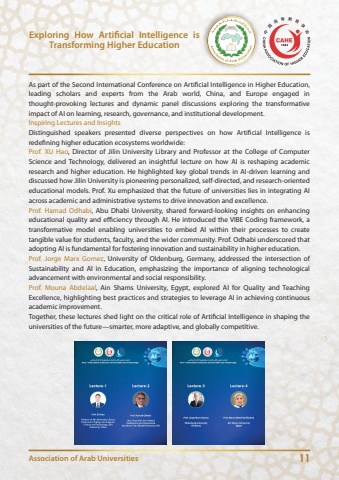 Association of Arab Universities 11As part of the Second International Conference on Artificial Intelligence in Higher Education, leading scholars and experts from the Arab world, China, and Europe engaged in thought-provoking lectures and dynamic panel discussions exploring the transformative impact of AI on learning, research, governance, and institutional development.Inspiring Lectures and InsightsDistinguished speakers presented diverse perspectives on how Artificial Intelligence is redefining higher education ecosystems worldwide:Prof. XU Hao, Director of Jilin University Library and Professor at the College of Computer Science and Technology, delivered an insightful lecture on how AI is reshaping academic research and higher education. He highlighted key global trends in AI-driven learning and discussed how Jilin University is pioneering personalized, self-directed, and research-oriented educational models. Prof. Xu emphasized that the future of universities lies in integrating AI across academic and administrative systems to drive innovation and excellence.Prof. Hamad Odhabi, Abu Dhabi University, shared forward-looking insights on enhancing educational quality and eflciency through AI. He introduced the VIBE Coding framework, a transformative model enabling universities to embed AI within their processes to create tangible value for students, faculty, and the wider community. Prof. Odhabi underscored that adopting AI is fundamental for fostering innovation and sustainability in higher education.Prof. Jorge Marx Gomez, University of Oldenburg, Germany, addressed the intersection of Sustainability and AI in Education, emphasizing the importance of aligning technological advancement with environmental and social responsibility.Prof. Mouna Abdelaal, Ain Shams University, Egypt, explored AI for Quality and Teaching Excellence, highlighting best practices and strategies to leverage AI in achieving continuous academic improvement.Together, these lectures shed light on the critical role of Artificial Intelligence in shaping the universities of the future%u2014smarter, more adaptive, and globally competitive.Exploring How Artificial Intelligence is Transforming Higher Education