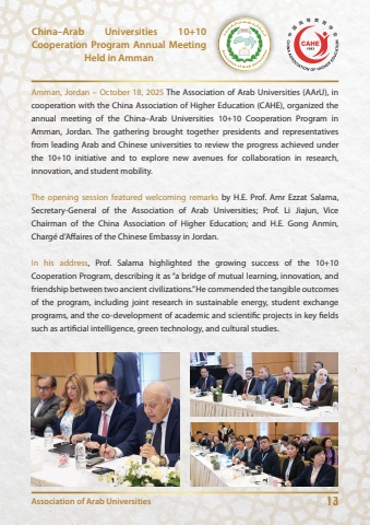 13China%u2013Arab Universities 10+10 Cooperation Program Annual Meeting Held in AmmanAssociation of Arab UniversitiesAmman, Jordan %u2013 October 18, 2025 The Association of Arab Universities (AArU), in cooperation with the China Association of Higher Education (CAHE), organized the annual meeting of the China%u2013Arab Universities 10+10 Cooperation Program in Amman, Jordan. The gathering brought together presidents and representatives from leading Arab and Chinese universities to review the progress achieved under the 10+10 initiative and to explore new avenues for collaboration in research, innovation, and student mobility.The opening session featured welcoming remarks by H.E. Prof. Amr Ezzat Salama, Secretary-General of the Association of Arab Universities; Prof. Li Jiajun, Vice Chairman of the China Association of Higher Education; and H.E. Gong Anmin, Charg%u00e9 d%u2019Affaires of the Chinese Embassy in Jordan.In his address, Prof. Salama highlighted the growing success of the 10+10 Cooperation Program, describing it as %u201ca bridge of mutual learning, innovation, and friendship between two ancient civilizations.%u201d He commended the tangible outcomes of the program, including joint research in sustainable energy, student exchange programs, and the co-development of academic and scientific projects in key fields such as artificial intelligence, green technology, and cultural studies.