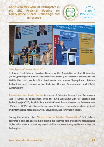 22Cairo, Egypt %u2013 October 14%u201315, 2025Prof. Amr Ezzat Salama, Secretary-General of the Association of Arab Universities (AArU) , participated in the Global Research Council (GRC) Regional Meeting for the Middle East and North Africa, held under the theme %u201cEquity-Based Science, Technology and Innovation for Inclusive Human Development and Global Sustainability.%u201dThe meeting was hosted by the Academy of Scientific Research and Technology (ASRT), Egypt, in cooperation with the King Abdulaziz City for Science and Technology (KACST), Saudi Arabia, and the Kuwait Foundation for the Advancement of Sciences (KFAS), with the participation of high-level representatives from regional and international research councils, universities, and innovation bodies.During the session titled %u201cResearch for Sustainable Communities,%u201d Prof. Salama delivered a keynote address highlighting the essential role of scientific research and higher education in advancing sustainability and community resilience across the Arab region.AArU Secretary-General Participates in the GRC Regional Meeting on Equity-Based Science, Technology, and InnovationAssociation of Arab Universities
