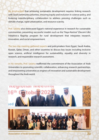 Association of Arab Universities 23He emphasized that achieving sustainable development requires linking research with local community priorities, ensuring equity and inclusion in science policy, and fostering interdisciplinary collaboration to address pressing challenges such as climate change, rapid urbanization, and resource scarcity.Prof. Salama also showcased Egypt%u2019s national experience in research for sustainable communities, presenting successful models such as the %u201cHaya Karima%u201d (Decent Life) Initiative-a ffiagship program for rural development that integrates research, innovation, and social empowerment.The two-day meeting gathered experts and policymakers from Egypt, Saudi Arabia, Kuwait, Qatar, Oman, and other countries to discuss key issues including inclusive open science, artificial intelligence for sustainability, equality and diversity in research, and responsible research assessment.In his remarks, Prof. Salama reaflrmed the commitment of the Association of Arab Universities to promoting scientific collaboration, enhancing research partnerships, and empowering universities as engines of innovation and sustainable development throughout the Arab world.