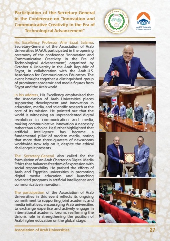 27Participation of the Secretary-General in the Conference on \Communicative Creativity in the Era of Technological Advancement\Association of Arab UniversitiesHis Excellency Professor Amr Ezzat Salama, Secretary-General of the Association of Arab Universities (AArU), participated in the opening ceremony of the conference %u201cInnovation and Communicative Creativity in the Era of Technological Advancement%u201d, organized by October 6 University in the Arab Republic of Egypt, in collaboration with the Arab-U.S. Association for Communication Educators. The event brought together a distinguished group of prominent academic and media figures from Egypt and the Arab world.In his address, His Excellency emphasized that the Association of Arab Universities places supporting development and innovation in education, media, and scientific research at the core of its mission. He pointed out that the world is witnessing an unprecedented digital revolution in communication and media, making communicative innovation a necessity rather than a choice. He further highlighted that artificial intelligence has become a fundamental pillar of modern media, noting that more than three-quarters of newsrooms worldwide now rely on it, despite the ethical challenges it presents.The Secretary-General also called for the formulation of an Arab Charter on Digital Media Ethics that balances freedom of expression with social responsibility. He praised the efforts of Arab and Egyptian universities in promoting digital media education and launching advanced programs in artificial intelligence and communicative innovation.The participation of the Association of Arab Universities in this event reffiects its ongoing commitment to supporting joint academic and media initiatives, encouraging Arab universities to exchange expertise and actively engage in international academic forums, reaflrming the Union%u2019s role in strengthening the position of Arab higher education on the global stage.