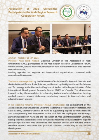 28Association of Arab Universities Participates in the Arab Region Research Cooperation ForumAssociation of Arab UniversitiesAmman %u2013 October 26%u201327, 2025Professor Anas Ratib Alsoud, Executive Director of the Association of Arab Universities (AArU), participated in the Arab Region Research Cooperation Forum, held in Amman, Jordan, with wide participation from representatives of Arab national research councils,funding agencies, and regional and international organizations concerned with research and innovation.The forum was organized by the Federation of Arab Scientific Research Councils and the Arab Council for the Social Sciences, and hosted by the Higher Council for Science and Technology in the Hashemite Kingdom of Jordan, with the participation of the International Development Research Centre (IDRC) of Canada. The discussions focused on key themes related to enhancing Arab research collaboration, funding applied research, science diplomacy, conducting research in times of crisis, and advancing open science.In his opening remarks, Professor Alsoud emphasized the commitment of the Association of Arab Universities, under the leadership of His Excellency Professor Amr Ezzat Salama, Secretary-General of AArU, to supporting applied scientific research and strengthening Arab integration in this vital field. He highlighted the strategic partnership between AArU and the Federation of Arab Scientific Research Councils, noting that the Association seeks through its initiatives to build effective regional partnerships that link Arab universities with research centers and industry, and to translate research outcomes into practical solutions contributing to sustainable development.