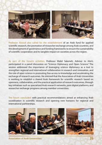 Association of Arab Universities 29Professor Alsoud also called for the establishment of an Arab fund for applied scientific research, the promotion of researcher exchange among Arab countries, and the development of governance and funding frameworks to ensure the sustainability of scientific cooperation and its tangible impact on societies across the region.As part of the forum%u2019s activities, Professor Walid Salameh, Advisor to AArU, participated in a panel discussion on %u201cScience Diplomacy and Open Science.%u201d The session addressed the importance of leveraging science diplomacy as a tool to strengthen regional and international collaboration in research and innovation, and the role of open science in promoting free access to knowledge and accelerating the exchange of research outcomes. He stressed that the Association of Arab Universities is working to establish a shared Arab framework for scientific research based on openness, collaboration, and the practical application of research outcomes, through key initiatives such as specialized Arab research networks, joint digital platforms, and researcher exchange programs among member universities.The forum concluded with practical recommendations aimed at enhancing Arab coordination in scientific research and opening new horizons for regional and international partnerships.