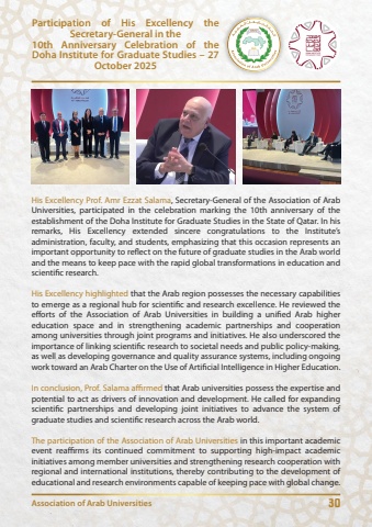 30Participation of His Excellency the Secretary-General in the10th Anniversary Celebration of the Doha Institute for Graduate Studies %u2013 27 October 2025Association of Arab UniversitiesHis Excellency Prof. Amr Ezzat Salama, Secretary-General of the Association of Arab Universities, participated in the celebration marking the 10th anniversary of the establishment of the Doha Institute for Graduate Studies in the State of Qatar. In his remarks, His Excellency extended sincere congratulations to the Institute%u2019s administration, faculty, and students, emphasizing that this occasion represents an important opportunity to reffiect on the future of graduate studies in the Arab world and the means to keep pace with the rapid global transformations in education and scientific research.His Excellency highlighted that the Arab region possesses the necessary capabilities to emerge as a regional hub for scientific and research excellence. He reviewed the efforts of the Association of Arab Universities in building a unified Arab higher education space and in strengthening academic partnerships and cooperation among universities through joint programs and initiatives. He also underscored the importance of linking scientific research to societal needs and public policy-making, as well as developing governance and quality assurance systems, including ongoing work toward an Arab Charter on the Use of Artificial Intelligence in Higher Education.In conclusion, Prof. Salama aflrmed that Arab universities possess the expertise and potential to act as drivers of innovation and development. He called for expanding scientific partnerships and developing joint initiatives to advance the system of graduate studies and scientific research across the Arab world.The participation of the Association of Arab Universities in this important academic event reaflrms its continued commitment to supporting high-impact academic initiatives among member universities and strengthening research cooperation with regional and international institutions, thereby contributing to the development of educational and research environments capable of keeping pace with global change.