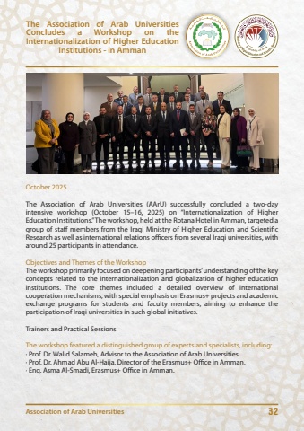 32The Association of Arab Universities Concludes a Workshop on the Internationalization of Higher Education Institutions - in AmmanAssociation of Arab UniversitiesOctober 2025The Association of Arab Universities (AArU) successfully concluded a two-day intensive workshop (October 15%u201316, 2025) on %u201cInternationalization of Higher Education Institutions.%u201d The workshop, held at the Rotana Hotel in Amman, targeted a group of staff members from the Iraqi Ministry of Higher Education and Scientific Research as well as international relations oflcers from several Iraqi universities, with around 25 participants in attendance.Objectives and Themes of the WorkshopThe workshop primarily focused on deepening participants%u2019 understanding of the key concepts related to the internationalization and globalization of higher education institutions. The core themes included a detailed overview of international cooperation mechanisms, with special emphasis on Erasmus+ projects and academic exchange programs for students and faculty members, aiming to enhance the participation of Iraqi universities in such global initiatives.Trainers and Practical SessionsThe workshop featured a distinguished group of experts and specialists, including:%u00b7 Prof. Dr. Walid Salameh, Advisor to the Association of Arab Universities.%u00b7 Prof. Dr. Ahmad Abu Al-Haija, Director of the Erasmus+ Oflce in Amman.%u00b7 Eng. Asma Al-Smadi, Erasmus+ Oflce in Amman.