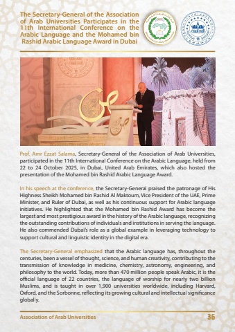 Prof. Amr Ezzat Salama, Secretary-General of the Association of Arab Universities, participated in the 11th International Conference on the Arabic Language, held from 22 to 24 October 2025, in Dubai, United Arab Emirates, which also hosted the presentation of the Mohamed bin Rashid Arabic Language Award.In his speech at the conference, the Secretary-General praised the patronage of His Highness Sheikh Mohamed bin Rashid Al Maktoum, Vice President of the UAE, Prime Minister, and Ruler of Dubai, as well as his continuous support for Arabic language initiatives. He highlighted that the Mohamed bin Rashid Award has become the largest and most prestigious award in the history of the Arabic language, recognizing the outstanding contributions of individuals and institutions in serving the language. He also commended Dubai%u2019s role as a global example in leveraging technology to support cultural and linguistic identity in the digital era.The Secretary-General emphasized that the Arabic language has, throughout the centuries, been a vessel of thought, science, and human creativity, contributing to the transmission of knowledge in medicine, chemistry, astronomy, engineering, and philosophy to the world. Today, more than 470 million people speak Arabic, it is the oflcial language of 22 countries, the language of worship for nearly two billion Muslims, and is taught in over 1,900 universities worldwide, including Harvard, Oxford, and the Sorbonne, reffiecting its growing cultural and intellectual significance globally.The Secretary-General of the Association of Arab Universities Participates in the 11th International Conference on the Arabic Language and the Mohamed bin Rashid Arabic Language Award in DubaiAssociation of Arab Universities 36