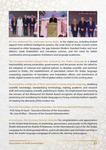 Association of Arab Universities 37He also addressed the challenges facing Arabic in the digital era, including limited support from artificial intelligence systems, the small share of Arabic content online compared to other languages, the gap between Modern Standard Arabic and local dialects, weak Arabization and translation policies, and the need for better coordination among academic institutions and language academies.The Secretary-General stressed that promoting the Arabic language is a shared responsibility among universities, governments, and the private sector. He called for the adoption of national and regional policies to develop scientific and technical content in Arabic, the establishment of specialized centers for Arabic language computing, expansion of translation and Arabization efforts, and enrichment of Arabic digital content to reach 10% of global online content in the coming years.He praised the central role of Arab universities in protecting the language, Arabizing scientific knowledge, standardizing terminology, training academic and research staff, and encouraging scientific publishing in Arabic. He emphasized that honoring the winners of the Mohamed bin Rashid Award recognizes all those dedicated to preserving and revitalizing the Arabic language as a living, evolving medium capable of meeting the demands of the modern era.From the Association of Arab Universities, the following attended the conference:%u00b7 Prof. Anas Al-Saud %u2013 Executive Director of the Association%u00b7 Ms. Lina Al-Bitar %u2013 Director of the General AdministrationIn conclusion, the Secretary-General extended his congratulations and appreciation to the United Arab Emirates, its leadership, government, and people, to His Highness Sheikh Mohamed bin Rashid Al Maktoum, to the International Council for the Arabic Language for its distinguished efforts, and to all attendees and innovators striving to keep the Arabic language a language of science, life, identity, and progress.