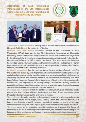 Association of Arab Universities Participates in the 9th International Conference on Electronic Publishing at the University of JordanProfessor Anas Ratib Alsoud, Executive Director of the Association of Arab Universities (AArU), took part in the 9th International Conference on Electronic Publishing, which commenced today in Amman, Jordan. The conference is organized by the Library of the University of Jordan, in cooperation with the Arab Federation for Libraries and Information (AFLI), under the theme: %u201cThe Interconnection between Knowledge Capital, Human Capital, and Generative Artificial Intelligence in Higher Education Institutions%u201d, and held under the patronage of His Excellency Prof. Nathir Obeidat, President of the University of Jordan.Dr. Alsoud emphasized that the participation of the Association reffiects its belief in the pivotal role played by Arab higher education institutions in building knowledge capital and embracing digital transformation and generative artificial intelligence in advancing education and scientific research. He noted that His Excellency Prof. Amr Ezzat Salama, Secretary-General of the Association of Arab Universities, consistently underscores the importance of strengthening partnerships among university associations, libraries, and information centers to promote open knowledge access and ensure the sustainability of Arab scientific research.Dr. Alsoud also highlighted that the conference chair, Dr. Mujahid Thenibat, heads one of the Association%u2019s aflliated institutions, the Arab Thesis and Dissertation Depository Center, hosted by the University of Jordan.The conference brought together a distinguished group of academics and experts from Jordan, Saudi Arabia, Egypt, Syria, Tunisia, Oman, the United Kingdom, and France, and featured scientific sessions, specialized workshops, and a technology exhibition showcasing the latest digital applications in libraries and higher education.The event serves as an important scientific platform for discussing the future of knowledge in the era of technological transformation, and for reinforcing the integration between artificial intelligence and human capital across Arab and global universities.Association of Arab Universities 38Association of Arab Universities Participates in the 9th International Conference on Electronic Publishing at the University of Jordan
