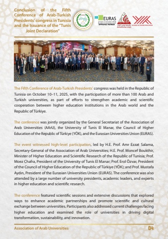 Association of Arab Universities 04The Fifth Conference of Arab-Turkish Presidents' congress was held in the Republic of Tunisia on October 10%u201311, 2025, with the participation of more than 100 Arab and Turkish universities, as part of efforts to strengthen academic and scientific cooperation between higher education institutions in the Arab world and the Republic of T%u00fcrkiye.The conference was jointly organized by the General Secretariat of the Association of Arab Universities (AArU), the University of Tunis El Manar, the Council of Higher Education of the Republic of T%u00fcrkiye (Y%u00d6K), and the Eurasian Universities Union (EURAS).The event witnessed high-level participation, led by H.E. Prof. Amr Ezzat Salama, Secretary-General of the Association of Arab Universities; H.E. Prof. Moncef Boukthir, Minister of Higher Education and Scientific Research of the Republic of Tunisia; Prof. Moez Chafra, President of the University of Tunis El Manar; Prof. Erol %u00d6zvar, President of the Council of Higher Education of the Republic of T%u00fcrkiye (Y%u00d6K); and Prof. Mustafa Ayd%u0131n, President of the Eurasian Universities Union (EURAS). The conference was also attended by a large number of university presidents, academic leaders, and experts in higher education and scientific research.The conference featured scientific sessions and extensive discussions that explored ways to enhance academic partnerships and promote scientific and cultural exchange between universities. Participants also addressed current challenges facing higher education and examined the role of universities in driving digital transformation, sustainability, and innovation.Conclusion of the Fifth Conference of Arab-Turkish Presidents' congress in Tunisia and the Issuance of the %u201cTunis Joint Declaration%u201d