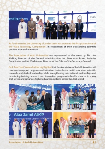 Association of Arab Universities 41As for the results, the University of Jordan team was crowned the first-place winner of the %u201cArab Toxicology Competition%u201d, in recognition of their outstanding scientific performance and teamwork.The Association of Arab Universities was represented at the event by: Ms. Lina Al-Bitar, Director of the General Administration, Ms. Dina Abu Razek, Activities Coordinator and Mr. Ziad Amara, Director of the Oflce of the Secretary-General.Prof. Amr Ezzat Salama further highlighted that the Association of Arab Universities will continue to support programs and initiatives that enhance health education, scientific research, and student leadership, while strengthening international partnerships and developing training, research, and innovation programs in health sciences, in a way that serves and advances higher education systems across the Arab world.