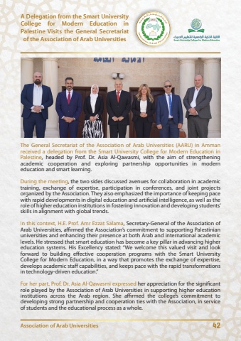 42A Delegation from the Smart University College for Modern Education in Palestine Visits the General Secretariat of the Association of Arab UniversitiesAssociation of Arab UniversitiesThe General Secretariat of the Association of Arab Universities (AARU) in Amman received a delegation from the Smart University College for Modern Education in Palestine, headed by Prof. Dr. Asia Al-Qawasmi, with the aim of strengthening academic cooperation and exploring partnership opportunities in modern education and smart learning.During the meeting, the two sides discussed avenues for collaboration in academic training, exchange of expertise, participation in conferences, and joint projects organized by the Association. They also emphasized the importance of keeping pace with rapid developments in digital education and artificial intelligence, as well as the role of higher education institutions in fostering innovation and developing students%u2019 skills in alignment with global trends.In this context, H.E. Prof. Amr Ezzat Salama, Secretary-General of the Association of Arab Universities, aflrmed the Association%u2019s commitment to supporting Palestinian universities and enhancing their presence at both Arab and international academic levels. He stressed that smart education has become a key pillar in advancing higher education systems. His Excellency stated: %u201cWe welcome this valued visit and look forward to building effective cooperation programs with the Smart University College for Modern Education, in a way that promotes the exchange of expertise, develops academic staff capabilities, and keeps pace with the rapid transformations in technology-driven education.%u201dFor her part, Prof. Dr. Asia Al-Qawasmi expressed her appreciation for the significant role played by the Association of Arab Universities in supporting higher education institutions across the Arab region. She aflrmed the college%u2019s commitment to developing strong partnership and cooperation ties with the Association, in service of students and the educational process as a whole.