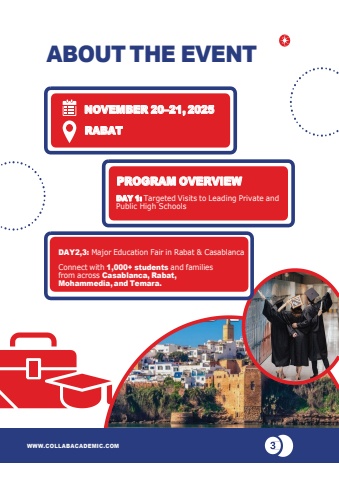 NOVEMBER 20%u201321, 2025RABATABOUT THE EVENTDAY2,3: Major Education Fair in Rabat & CasablancaConnect with 1,000+ students and familiesfrom across Casablanca, Rabat, Mohammedia, and Temara.WWW.COLLABACADEMIC.COMPROGRAM OVERVIEWDAY 1: Targeted Visits to Leading Private and Public High Schools