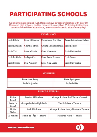 CASABLANCAEcole Elbilia Ecole Romandie Ecole TaziEcole Le CedreEcole SubriniEcole El MedinaCharif El IdrissiL%u00e9on AfricainLa P%u00e9pini%u00e8rePole AcademyComp%u00e9tence Ain Sbaa Groupe Scolaire BerradaEcole AlexanderEcole Louis BertrandEcole Vale DanfaAnisse International School Ecole Le PontEcole Universalis%u00e9Ecole SanaaEcole Universalis%u00e9RABAT & TEMARAPARTICIPATING SCHOOLSCollab International and ICES Morocco have direct partnerships with over 50Moroccan high schools, and for this event, more than 35 leading institutions have confirmed their attendance, even more choose to attend every day!CASABLANCAEcole Elbilia Ecole El Medina Comp%u00e9tence Ain Sbaa Anisse International SchoolEcole Romandie Charif El Idrissi Groupe Scolaire Berrada Ecole Le PontEcole Tazi L%u00e9on Africain Ecole Alexander Ecole Universalis%u00e9Ecole Le Cedre La P%u00e9pini%u00e8re Ecole Louis Bertrand Ecole SanaaEcole Subrini Pole Academy Ecole Vale Danfa Ecole Universalis%u00e9MOHHEDIAEcole Jules Ferry Ecole PythagoreEcole Majorelle Ecole Galil%u00e9eRABAT & TEMARABlaisePascalInstitut Al Manbaa Groupe Scolaire Paul Verne %u2013 SouissiLouis LeGrandGroupe Scolaire High Tech Zenith School %u2013 TemaraElbilia SkolarAndr%u00e9 Malraux Groupe Scolaire Henry Matisse %u2013 TemaraAl Minbat Fleurs de l%u2019%u00c2ge %u2013 Temara Madariss Maria %u2013 TemaraWWW.COLLABACADEMIC.COM