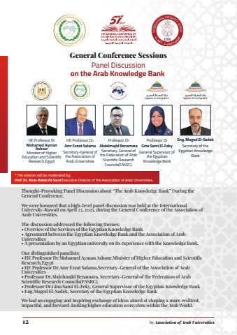 12 by Association of Arab UniversitiesThought-Provoking Panel Discussion about %u201cThe Arab Knowledge Bank%u201d During the General Conference.We were honored that a high-level panel discussion was held at the International University-Kuwait on April 23, 2025, during the General Conference of the Association of Arab Universities.The discussion addressed the following themes:%u2022 Overview of the Services of the Egyptian Knowledge Bank%u2022 Agreement between the Egyptian Knowledge Bank and the Association of Arab Universities%u2022 A presentation by an Egyptian university on its experience with the Knowledge Bank.Our distinguished panelists:%u2022 HE Professor Dr.Mohamed Ayman Ashour,Minister of Higher Education and Scientific Research,Egypt%u2022 HE Professor Dr.Amr Ezzat Salama,Secretary-General of the Association of Arab Universities%u2022 Professor Dr.Abdelmajid Benamara, Secretary-General of the Federation of Arab Scientific Research Councils(FASRC).%u2022 Professor Dr.Gina Sami El-Feky, General Supervisor of the Egyptian Knowledge Bank%u2022 Eng.Maged El-Sadek, Secretary of the Egyptian Knowledge BankWe had an engaging and inspiring exchange of ideas aimed at shaping a more resilient, impactful, and forward-looking higher education ecosystem within the Arab World.Eng. Maged El-SadekSecretary of the Egyptian Knowledge BankProfessor DrGina Sami El-FekyGeneral Supervisor of the Egyptian Knowledge BankProfessor DrAbdelmajid BenamaraSecretary-General of the Federation of Arab Scientific Research Councils(FASRC).HE Professor Dr. Amr Ezzat SalamaSecretary-General of the Association of Arab UniversitiesHE Professor DrMohamed Ayman AshourMinister of Higher Education and Scientific Research,EgyptPanel Discussionon the Arab Knowledge Bank General Conference Sessions* The session will be moderated by:Prof. Dr. Anas Rateb Al-Saud Executive Director of the Association of Arab Universities.