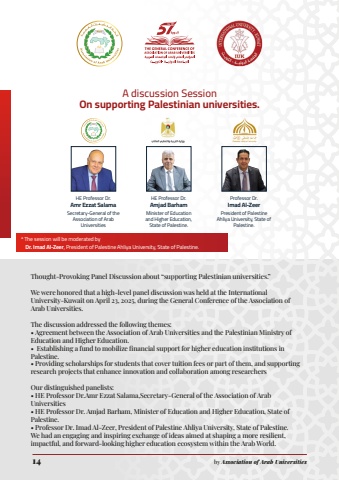 14 by Association of Arab UniversitiesThought-Provoking Panel Discussion about %u201csupporting Palestinian universities.%u201dWe were honored that a high-level panel discussion was held at the International University-Kuwait on April 23, 2025, during the General Conference of the Association of Arab Universities.The discussion addressed the following themes:%u2022 Agreement between the Association of Arab Universities and the Palestinian Ministry of Education and Higher Education.%u2022 Establishing a fund to mobilize financial support for higher education institutions in Palestine.%u2022 Providing scholarships for students that cover tuition fees or part of them, and supporting research projects that enhance innovation and collaboration among researchersOur distinguished panelists:%u2022 HE Professor Dr.Amr Ezzat Salama,Secretary-General of the Association of Arab Universities%u2022 HE Professor Dr. Amjad Barham, Minister of Education and Higher Education, State of Palestine.%u2022 Professor Dr. Imad Al-Zeer, President of Palestine Ahliya University, State of Palestine.We had an engaging and inspiring exchange of ideas aimed at shaping a more resilient, impactful, and forward-looking higher education ecosystem within the Arab World.A discussion SessionOn supporting Palestinian universities.Professor Dr.Imad Al-ZeerPresident of Palestine Ahliya University, State of Palestine.HE Professor Dr.Amjad BarhamMinister of Education and Higher Education, State of Palestine.HE Professor Dr. Amr Ezzat SalamaSecretary-General of the Association of Arab Universities* The session will be moderated by Dr. Imad Al-Zeer, President of Palestine Ahliya University, State of Palestine.