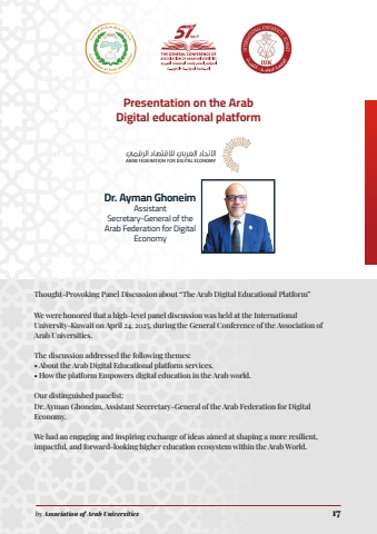 by Association of Arab Universities 17Thought-Provoking Panel Discussion about %u201cThe Arab Digital Educational Platform%u201dWe were honored that a high-level panel discussion was held at the International University-Kuwait on April 24, 2025, during the General Conference of the Association of Arab Universities.The discussion addressed the following themes:%u2022 About the Arab Digital Educational platform services.%u2022 How the platform Empowers digital education in the Arab world.Our distinguished panelist:Dr. Ayman Ghoneim, Assistant Seceretary-General of the Arab Federation for Digital Economy.We had an engaging and inspiring exchange of ideas aimed at shaping a more resilient, impactful, and forward-looking higher education ecosystem within the Arab World.Presentation on the ArabDigital educational platformDr. Ayman GhoneimAssistantSecretary-General of theArab Federation for DigitalEconomy
