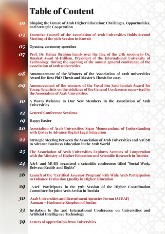 Table of ContentShaping the Future of Arab Higher Education: Challenges, Opportunities, and Strategic CooperationExecutive Council of the Association of Arab Universities Holds Second Meeting of the 56th Session in KuwaitOpening ceremony speechesProf. Dr. Bahaa Ibrahim hands over the flag of the 57th session to Dr. Barakat Awad Al-Hdiban, President of the International University of Technology, during the opening of the annual general conference of the association of arab universities.Announcement of the Winners of the Association of arab universities Award for Best PhD Thesis and Master's Thesis for 2025Announcement of the winners of the Yusuf bin Said Loutah Award for Young Scientists on the sidelines of the General Conference supervised by the Association of Arab UniversitiesA Warm Welcome to Our New Members in the Association of Arab UniversitiesGeneral Conference SessionsHappy EasterAssociation of Arab Universities Signs Memorandum of Understanding with Qistas to Advance Digital Legal EducationStrategic Meeting Between the Association of Arab Universities and AACSB to Advance Business Education in the Arab WorldThe Association of Arab Universities Explores Avenues of Cooperation with the Ministry of Higher Education and Scientific Research in TunisiaAArU and MUBS organized a scientific conference titled \Between Reality and Rights\Launch of the \to Enhance Evaluation Quality in Higher Education AArU Participates in the 57th Session of the Higher Coordination Committee for Joint Arab Action in Tunisia Arab Universities and Recruitment Agencies Forum (AURAF) Amman %u2013 Hashemite Kingdom of JordanInvitation to the 2nd International Conference on Universities and Artificial Intelligence TechnologyLetters of appreciation from Universities010305070809101219202223242629303339