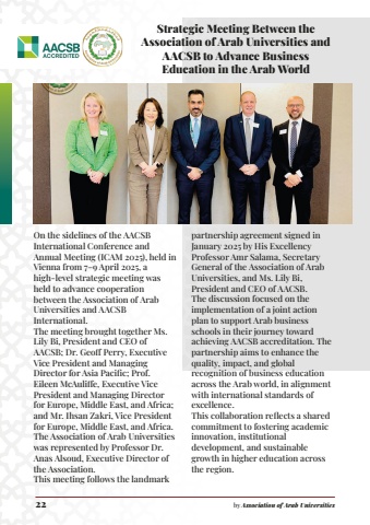 Strategic Meeting Between the Association of Arab Universities and AACSB to Advance Business Education in the Arab WorldOn the sidelines of the AACSB International Conference and Annual Meeting (ICAM 2025), held in Vienna from 7%u20139 April 2025, a high-level strategic meeting was held to advance cooperation between the Association of Arab Universities and AACSB International.The meeting brought together Ms. Lily Bi, President and CEO of AACSB; Dr. Geoff Perry, Executive Vice President and Managing Director for Asia Pacific; Prof. Eileen McAuliffe, Executive Vice President and Managing Director for Europe, Middle East, and Africa; and Mr. Ihsan Zakri, Vice President for Europe, Middle East, and Africa. The Association of Arab Universities was represented by Professor Dr. Anas Alsoud, Executive Director of the Association.This meeting follows the landmark partnership agreement signed in January 2025 by His Excellency Professor Amr Salama, Secretary General of the Association of Arab Universities, and Ms. Lily Bi, President and CEO of AACSB.The discussion focused on the implementation of a joint action plan to support Arab business schools in their journey toward achieving AACSB accreditation. The partnership aims to enhance the quality, impact, and global recognition of business education across the Arab world, in alignment with international standards of excellence.This collaboration reflects a shared commitment to fostering academic innovation, institutional development, and sustainable growth in higher education across the region.22 by Association of Arab Universities
