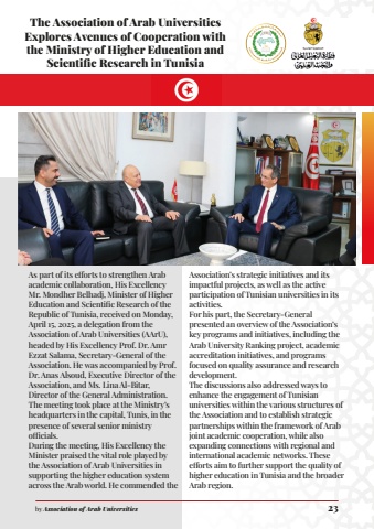 As part of its efforts to strengthen Arab academic collaboration, His Excellency Mr. Mondher Belhadj, Minister of Higher Education and Scientific Research of the Republic of Tunisia, received on Monday, April 15, 2025, a delegation from the Association of Arab Universities (AArU), headed by His Excellency Prof. Dr. Amr Ezzat Salama, Secretary-General of the Association. He was accompanied by Prof. Dr. Anas Alsoud, Executive Director of the Association, and Ms. Lina Al-Bitar, Director of the General Administration. The meeting took place at the Ministry%u2019s headquarters in the capital, Tunis, in the presence of several senior ministry officials.During the meeting, His Excellency the Minister praised the vital role played by the Association of Arab Universities in supporting the higher education system across the Arab world. He commended the Association%u2019s strategic initiatives and its impactful projects, as well as the active participation of Tunisian universities in its activities.For his part, the Secretary-General presented an overview of the Association%u2019s key programs and initiatives, including the Arab University Ranking project, academic accreditation initiatives, and programs focused on quality assurance and research development.The discussions also addressed ways to enhance the engagement of Tunisian universities within the various structures of the Association and to establish strategic partnerships within the framework of Arab joint academic cooperation, while also expanding connections with regional and international academic networks. These efforts aim to further support the quality of higher education in Tunisia and the broader Arab region.The Association of Arab Universities Explores Avenues of Cooperation with the Ministry of Higher Education and Scientific Research in Tunisiaby Association of Arab Universities 23