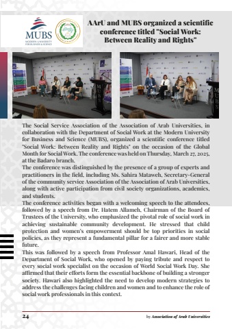 The Social Service Association of the Association of Arab Universities, in collaboration with the Department of Social Work at the Modern University for Business and Science (MUBS), organized a scientific conference titled \Month for Social Work. The conference was held on Thursday, March 27, 2025, at the Badaro branch.The conference was distinguished by the presence of a group of experts and practitioners in the field, including Ms. Sahira Mataweh, Secretary-General of the community service Association of the Association of Arab Universities, along with active participation from civil society organizations, academics, and students.The conference activities began with a welcoming speech to the attendees, followed by a speech from Dr. Hatem Allameh, Chairman of the Board of Trustees of the University, who emphasized the pivotal role of social work in achieving sustainable community development. He stressed that child protection and women%u2019s empowerment should be top priorities in social policies, as they represent a fundamental pillar for a fairer and more stable future.This was followed by a speech from Professor Amal Hawari, Head of the Department of Social Work, who opened by paying tribute and respect to every social work specialist on the occasion of World Social Work Day. She affirmed that their efforts form the essential backbone of building a stronger society. Hawari also highlighted the need to develop modern strategies to address the challenges facing children and women and to enhance the role of social work professionals in this context.AArU and MUBS organized a scientific conference titled \Between Reality and Rights\24 by Association of Arab Universities