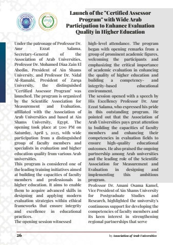 Under the patronage of Professor Dr. Amr Ezzat Salama, Secretary-General of the Association of Arab Universities, Professor Dr. Mohamed Diaa Zain El Abedin, President of Ain Shams University, and Professor Dr. Nidal Al-Ramahi, President of Zarqa University, the distinguished \launched. The program is organized by the Scientific Association for Measurement and Evaluation, affiliated with the Association of Arab Universities and based at Ain Shams University, Egypt. The opening took place at 5:00 PM on Saturday, April 5, 2025, with wide participation from a distinguished group of faculty members and specialists in evaluation and higher education quality from various Arab universities.This program is considered one of the leading training initiatives aimed at building the capacities of faculty members and professionals in higher education. It aims to enable them to acquire advanced skills in designing and applying modern evaluation strategies within ethical frameworks that ensure integrity and excellence in educational practices.The opening session witnessed high-level attendance. The program began with opening remarks from a group of prominent academic figures, welcoming the participants and emphasizing the critical importance of academic evaluation in enhancing the quality of higher education and building a competency- and integrity-based educational environment.The session opened with a speech by His Excellency Professor Dr. Amr Ezzat Salama, who expressed his pride in this outstanding program. He pointed out that the Association of Arab Universities pays great attention to building the capacities of faculty members and enhancing their competencies in evaluation fields to ensure high-quality educational outcomes. He also praised the ongoing partnership among Arab universities and the leading role of the Scientific Association for Measurement and Evaluation in designing and implementing this ambitious program.Professor Dr. Amani Osama Kamel, Vice President of Ain Shams University for Postgraduate Studies and Research, highlighted the university's continuous support for developing the competencies of faculty members and its keen interest in strengthening regional partnerships that serve Launch of the \Program\Participation to Enhance Evaluation Quality in Higher Education26 by Association of Arab Universities