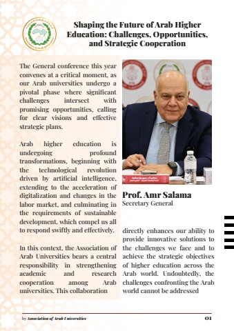 by Association of Arab Universities 01Prof. Amr SalamaSecretary GeneralShaping the Future of Arab Higher Education: Challenges, Opportunities, and Strategic CooperationThe General conference this year convenes at a critical moment, as our Arab universities undergo a pivotal phase where significant challenges intersect with promising opportunities, calling for clear visions and effective strategic plans.Arab higher education is undergoing profound transformations, beginning with the technological revolution driven by artificial intelligence, extending to the acceleration of digitalization and changes in the labor market, and culminating in the requirements of sustainable development, which compel us all to respond swiftly and effectively.In this context, the Association of Arab Universities bears a central responsibility in strengthening academic and research cooperation among Arab universities. This collaboration directly enhances our ability to provide innovative solutions to the challenges we face and to achieve the strategic objectives of higher education across the Arab world. Undoubtedly, the challenges confronting the Arab world cannot be addressed