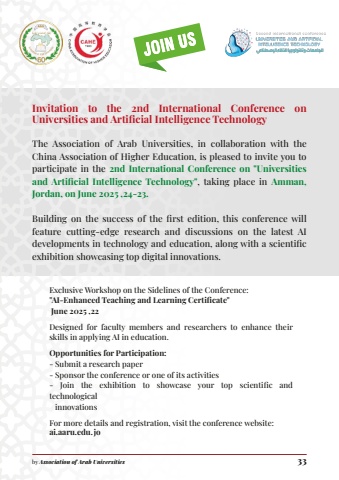 Invitation to the 2nd International Conference on Universities and Artificial Intelligence TechnologyThe Association of Arab Universities, in collaboration with the China Association of Higher Education, is pleased to invite you to participate in the 2nd International Conference on \and Artificial Intelligence Technology\Jordan, on June 2025 ,24-23.Building on the success of the first edition, this conference will feature cutting-edge research and discussions on the latest AI developments in technology and education, along with a scientific exhibition showcasing top digital innovations.Exclusive Workshop on the Sidelines of the Conference:\ June 2025 ,22Designed for faculty members and researchers to enhance their skills in applying AI in education.Opportunities for Participation:- Submit a research paper- Sponsor the conference or one of its activities- Join the exhibition to showcase your top scientific and technological innovationsFor more details and registration, visit the conference website:ai.aaru.edu.joby Association of Arab Universities 33