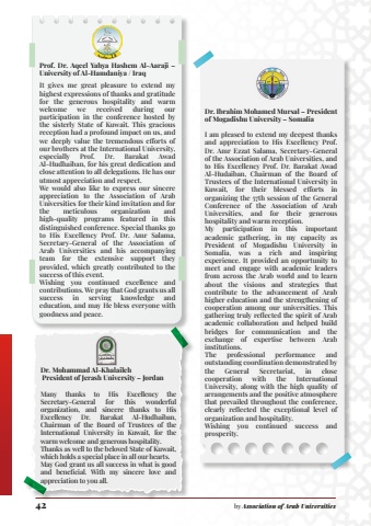 42 by Association of Arab UniversitiesDr. Mohammad Al-Khalaileh President of Jerash University %u2013 JordanMany thanks to His Excellency the Secretary-General for this wonderful organization, and sincere thanks to His Excellency Dr. Barakat Al-Hudhaiban, Chairman of the Board of Trustees of the International University in Kuwait, for the warm welcome and generous hospitality.Thanks as well to the beloved State of Kuwait, which holds a special place in all our hearts.May God grant us all success in what is good and beneficial. With my sincere love and appreciation to you all.Prof. Dr. Aqeel Yahya Hashem Al-Aaraji %u2013 University of Al-Hamdaniya / IraqIt gives me great pleasure to extend my highest expressions of thanks and gratitude for the generous hospitality and warm welcome we received during our participation in the conference hosted by the sisterly State of Kuwait. This gracious reception had a profound impact on us, and we deeply value the tremendous efforts of our brothers at the International University, especially Prof. Dr. Barakat Awad Al-Hudhaiban, for his great dedication and close attention to all delegations. He has our utmost appreciation and respect.We would also like to express our sincere appreciation to the Association of Arab Universities for their kind invitation and for the meticulous organization and high-quality programs featured in this distinguished conference. Special thanks go to His Excellency Prof. Dr. Amr Salama, Secretary-General of the Association of Arab Universities and his accompanying team for the extensive support they provided, which greatly contributed to the success of this event.Wishing you continued excellence and contributions. We pray that God grants us all success in serving knowledge and education, and may He bless everyone with goodness and peace.Dr. Ibrahim Mohamed Mursal %u2013 President of Mogadishu University %u2013 SomaliaI am pleased to extend my deepest thanks and appreciation to His Excellency Prof. Dr. Amr Ezzat Salama, Secretary-General of the Association of Arab Universities, and to His Excellency Prof. Dr. Barakat Awad Al-Hudaiban, Chairman of the Board of Trustees of the International University in Kuwait, for their blessed efforts in organizing the 57th session of the General Conference of the Association of Arab Universities, and for their generous hospitality and warm reception.My participation in this important academic gathering, in my capacity as President of Mogadishu University in Somalia, was a rich and inspiring experience. It provided an opportunity to meet and engage with academic leaders from across the Arab world and to learn about the visions and strategies that contribute to the advancement of Arab higher education and the strengthening of cooperation among our universities. This gathering truly reflected the spirit of Arab academic collaboration and helped build bridges for communication and the exchange of expertise between Arab institutions.The professional performance and outstanding coordination demonstrated by the General Secretariat, in close cooperation with the International University, along with the high quality of arrangements and the positive atmosphere that prevailed throughout the conference, clearly reflected the exceptional level of organization and hospitality.Wishing you continued success and prosperity.