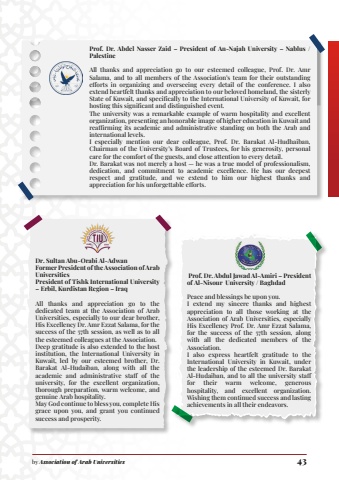 by Association of Arab Universities 43 Prof. Dr. Abdul Jawad Al-Amiri %u2013 President of Al-Nisour University / BaghdadPeace and blessings be upon you.I extend my sincere thanks and highest appreciation to all those working at the Association of Arab Universities, especially His Excellency Prof. Dr. Amr Ezzat Salama, for the success of the 57th session, along with all the dedicated members of the Association.I also express heartfelt gratitude to the International University in Kuwait, under the leadership of the esteemed Dr. Barakat Al-Hudaiban, and to all the university staff for their warm welcome, generous hospitality, and excellent organization. Wishing them continued success and lasting achievements in all their endeavors.Dr. Sultan Abu-Orabi Al-AdwanFormer President of the Association of Arab UniversitiesPresident of Tishk International University %u2013 Erbil, Kurdistan Region %u2013 IraqAll thanks and appreciation go to the dedicated team at the Association of Arab Universities, especially to our dear brother, His Excellency Dr. Amr Ezzat Salama, for the success of the 57th session, as well as to all the esteemed colleagues at the Association.Deep gratitude is also extended to the host institution, the International University in Kuwait, led by our esteemed brother, Dr. Barakat Al-Hudaiban, along with all the academic and administrative staff of the university, for the excellent organization, thorough preparation, warm welcome, and genuine Arab hospitality.May God continue to bless you, complete His grace upon you, and grant you continued success and prosperity.Prof. Dr. Abdel Nasser Zaid %u2013 President of An-Najah University %u2013 Nablus / PalestineAll thanks and appreciation go to our esteemed colleague, Prof. Dr. Amr Salama, and to all members of the Association%u2019s team for their outstanding efforts in organizing and overseeing every detail of the conference. I also extend heartfelt thanks and appreciation to our beloved homeland, the sisterly State of Kuwait, and specifically to the International University of Kuwait, for hosting this significant and distinguished event.The university was a remarkable example of warm hospitality and excellent organization, presenting an honorable image of higher education in Kuwait and reaffirming its academic and administrative standing on both the Arab and international levels.I especially mention our dear colleague, Prof. Dr. Barakat Al-Hudhaiban, Chairman of the University%u2019s Board of Trustees, for his generosity, personal care for the comfort of the guests, and close attention to every detail.Dr. Barakat was not merely a host %u2014 he was a true model of professionalism, dedication, and commitment to academic excellence. He has our deepest respect and gratitude, and we extend to him our highest thanks and appreciation for his unforgettable efforts.