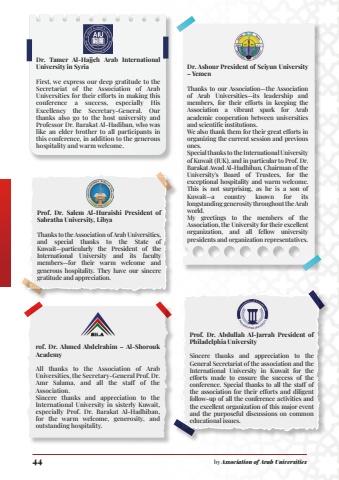 44 by Association of Arab UniversitiesProf. Dr. Salem Al-Huraishi President of Sabratha University, LibyaThanks to the Association of Arab Universities, and special thanks to the State of Kuwait%u2014particularly the President of the International University and its faculty members%u2014for their warm welcome and generous hospitality. They have our sincere gratitude and appreciation.Prof. Dr. Abdullah Al-Jarrah President of Philadelphia UniversitySincere thanks and appreciation to the General Secretariat of the association and the International University in Kuwait for the efforts made to ensure the success of the conference. Special thanks to all the staff of the association for their efforts and diligent follow-up of all the conference activities and the excellent organization of this major event and the purposeful discussions on common educational issues.rof. Dr. Ahmed Abdelrahim %u2013 Al-Shorouk AcademyAll thanks to the Association of Arab Universities, the Secretary-General Prof. Dr. Amr Salama, and all the staff of the Association.Sincere thanks and appreciation to the International University in sisterly Kuwait, especially Prof. Dr. Barakat Al-Hadhiban, for the warm welcome, generosity, and outstanding hospitality.Dr. Tamer Al-Hajjeh Arab International University in SyriaFirst, we express our deep gratitude to the Secretariat of the Association of Arab Universities for their efforts in making this conference a success, especially His Excellency the Secretary-General. Our thanks also go to the host university and Professor Dr. Barakat Al-Hadiban, who was like an elder brother to all participants in this conference, in addition to the generous hospitality and warm welcome.Dr. Ashour President of Seiyun University %u2013 YemenThanks to our Association%u2014the Association of Arab Universities%u2014its leadership and members, for their efforts in keeping the Association a vibrant spark for Arab academic cooperation between universities and scientific institutions.We also thank them for their great efforts in organizing the current session and previous ones.Special thanks to the International University of Kuwait (IUK), and in particular to Prof. Dr. Barakat Awad Al-Hadhiban, Chairman of the University's Board of Trustees, for the exceptional hospitality and warm welcome. This is not surprising, as he is a son of Kuwait%u2014a country known for its longstanding generosity throughout the Arab world.My greetings to the members of the Association, the University for their excellent organization, and all fellow university presidents and organization representatives.