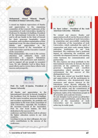 by Association of Arab Universities 47Mohammad Ahmed Mbarak Daqali, President of Zintan University, Libya.I extend my highest expressions of thanks and appreciation to the organizing committee of the General Conference of the Association of Arab Universities, headed by Professor Dr. Barakat Al-Hadiban, President of the International University in Kuwait, and to all our family in the State of Kuwait for their generous hospitality, warm reception, and excellent organization of this important event. We also extend our sincere thanks and appreciation to the Secretary-General of the Association of Arab Universities and the Executive Council of the Association.What distinguishes this event is the serious attention and solidarity from Arab universities to support Palestinian universities, both professors and students, and to support all our people in wounded Gaza. We ask Almighty God to bless these good efforts and to crown these efforts with success and prosperity.Dr. Bara' Asfour - President of the Arab American University - PalestineWe extend our sincere thanks and appreciation to all of you for the great efforts made by the Association of Arab Universities in organizing and successfully conducting the Conference of the Association of Arab Universities, which embodied the spirit of cooperation and joint work among higher education institutions in our Arab homeland. The conference had a profound impact on enhancing the academic and scientific development journey and opening wider horizons for communication and partnership.We also express our deep gratitude to the International University in Kuwait, the host university of the conference, for their generous hospitality and excellent organization, which provided an ideal environment for the success of this distinguished event.We must also extend our heartfelt thanks and appreciation to all the participants in the conference, who demonstrated deep awareness and sincere interest in the Palestinian cause, thereby affirming its central position in the hearts and minds of the Arab nation, and the commitment of higher education institutions to support the legitimate rights of the Palestinian people in all scientific and academic forums.We ask Almighty God to grant you all further progress and contribution, and to bless the efforts of the Association of Arab Universities and its journey towards achieving its noble goals.Prof. Dr. Lotfi Al-Qasim, President of Sousse UniversityAll thanks and appreciation to the International University in Kuwait, headed by His Excellency Prof. Dr. Barakat Al-Hadiban, for the warm reception, generous hospitality, and excellent organization. My gratitude and appreciation to the team of the Association of Arab Universities, especially His Excellency the Secretary-General of the Association, Prof. Dr. Amr Ezzat Salama, for their dedication to the success of theconference and their tireless work to advance the higher education system in our Arab countries.Greetings to you, my dear colleagues, for your active contributions to the success of the conference.