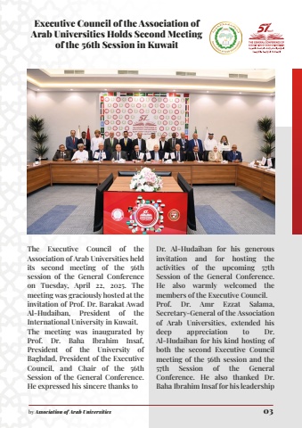 The Executive Council of the Association of Arab Universities held its second meeting of the 56th session of the General Conference on Tuesday, April 22, 2025. The meeting was graciously hosted at the invitation of Prof. Dr. Barakat Awad Al-Hudaiban, President of the International University in Kuwait.The meeting was inaugurated by Prof. Dr. Baha Ibrahim Insaf, President of the University of Baghdad, President of the Executive Council, and Chair of the 56th Session of the General Conference. He expressed his sincere thanks to Dr. Al-Hudaiban for his generous invitation and for hosting the activities of the upcoming 57th Session of the General Conference. He also warmly welcomed the members of the Executive Council.Prof. Dr. Amr Ezzat Salama, Secretary-General of the Association of Arab Universities, extended his deep appreciation to Dr. Al-Hudaiban for his kind hosting of both the second Executive Council meeting of the 56th session and the 57th Session of the General Conference. He also thanked Dr. Baha Ibrahim Insaf for his leadership Executive Council of the Association of Arab Universities Holds Second Meeting of the 56th Session in Kuwaitby Association of Arab Universities 03