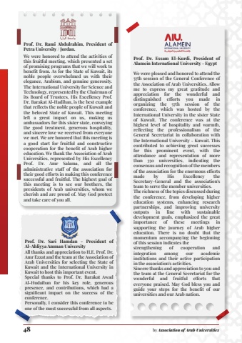 48 by Association of Arab UniversitiesProf. Dr. Essam El-Kurdi, President of Alamein International University - EgyptWe were pleased and honored to attend the 57th session of the General Conference of the Association of Arab Universities. Allow me to express my great gratitude and appreciation for the wonderful and distinguished efforts you made in organizing the 57th session of the conference, which was hosted by the International University in the sister State of Kuwait. The conference was at the highest level of hospitality and warmth, reflecting the professionalism of the General Secretariat in collaboration with the International University - Kuwait. This contributed to achieving great successes for this prominent event, with the attendance and representation of more than 350 universities, indicating the consensus and recognition of the members of the association for the enormous efforts made by His Excellency the Secretary-General and the association's team to serve the member universities.The richness of the topics discussed during the conference, from developing higher education systems, enhancing research partnerships, and improving university outputs in line with sustainable development goals, emphasized the great importance of these meetings in supporting the journey of Arab higher education. There is no doubt that the momentum accompanying the beginning of this session indicates thestrengthening of cooperation and integration among our academic institutions and their active participation in the association's activities.Sincere thanks and appreciation to you and the team at the General Secretariat for the wonderful and fruitful efforts that everyone praised. May God bless you and guide your steps for the benefit of our universities and our Arab nation.Prof. Dr. Rami Abdulrahim, President of Petra University / Jordan.We were honored to attend the activities of this fruitful meeting, which presented a set of promising programs that we will work to benefit from. As for the State of Kuwait, its noble people overwhelmed us with their elegance, Arabism, and genuine generosity. The International University for Science and Technology, represented by the Chairman of its Board of Trustees, His Excellency Prof. Dr. Barakat Al-Hadiban, is the best example that reflects the noble people of Kuwait and the beloved State of Kuwait. This meeting left a great impact on us, making us ambassadors for this sister state, conveying the good treatment, generous hospitality, and sincere love we received from everyone we met. We are honored that this meeting is a good start for fruitful and constructive cooperation for the benefit of Arab higher education. We thank the Association of Arab Universities, represented by His Excellency Prof. Dr. Amr Salama, and all the administrative staff of the association for their good efforts in making this conference successful and fruitful. The highest goal of this meeting is to see our brothers, the presidents of Arab universities, whom we cherish and are proud of. May God protect and take care of you all.Prof. Dr. Sari Hamdan - President of Al-Ahliyya Amman UniversityAll thanks and appreciation to H.E. Prof. Dr. Amr Ezzat and the team at the Association of Arab Universities for selecting the State of Kuwait and the International University in Kuwait to host this important event.Special thanks to Prof. Dr. Barakat Awad Al-Hudaiban for his key role, generous presence, and contributions, which had a significant impact on the success of the conference.Personally, I consider this conference to be one of the most successful from all aspects.