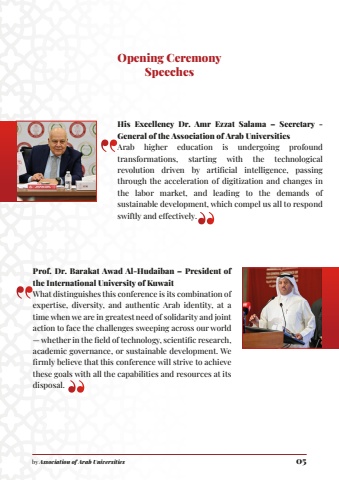 His Excellency Dr. Amr Ezzat Salama %u2013 Secretary - General of the Association of Arab UniversitiesArab higher education is undergoing profound transformations, starting with the technological revolution driven by artificial intelligence, passing through the acceleration of digitization and changes in the labor market, and leading to the demands of sustainable development, which compel us all to respond swiftly and effectively.Prof. Dr. Barakat Awad Al-Hudaiban %u2013 President of the International University of KuwaitWhat distinguishes this conference is its combination of expertise, diversity, and authentic Arab identity, at a time when we are in greatest need of solidarity and joint action to face the challenges sweeping across our world %u2014 whether in the field of technology, scientific research, academic governance, or sustainable development. We firmly believe that this conference will strive to achieve these goals with all the capabilities and resources at its disposal.Opening CeremonySpeechesby Association of Arab Universities 05
