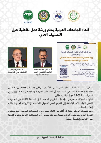 %u0627%u062a%u062d%u0627%u062f %u0627%u0644%u062c%u0627%u0645%u0639%u0627%u062a %u0627%u0644%u0639%u0631%u0628%u064a%u0629 %u064a%u0646%u0638%u0645 %u0648%u0631%u0634%u0629 %u0639%u0645%u0644 %u062a%u0641%u0627%u0639%u0644%u064a%u0629 %u062d%u0648%u0644 %u0627%u0644%u062a%u0635%u0646%u064a%u0641 %u0627%u0644%u0639%u0631%u0628%u064a%u0651%u0639%u0645%u0627%u0646 %u2013 %u0646%u0638%u0645 %u0627%u062a%u062d%u0627%u062f %u0627%u0644%u062c%u0627%u0645%u0639%u0627%u062a %u0627%u0644%u0639%u0631%u0628%u064a%u0629%u060c %u064a%u0648%u0645 %u0627%u0644%u0625%u062b%u0646%u064a%u0646 %u0627%u0644%u0645%u0648%u0627%u0641%u0642 26 %u0645%u0627%u064a%u0648 2025 %u060c%u0648%u0631%u0634%u0629 %u0639%u0645%u0644 %u062a%u0641%u0627%u0639%u0644%u064a%u0629 %u0645%u062e%u0635%u0635%u0629 %u0644%u0645%u0646%u0633%u0642%u064a %u0627%u0644%u062a%u0635%u0646%u064a%u0641 %u0641%u064a %u0627%u0644%u062c%u0627%u0645%u0639%u0627%u062a %u0627%u0644%u0639%u0631%u0628%u064a%u0629%u060c %u0648%u0630%u0644%u0643 %u0639%u0628%u0631 %u0645%u0646%u0635%u0629 \%u0632%u0648%u0648%u0645\%u0641%u064a %u062a%u0645%u0627%u0645 %u0627%u0644%u0633%u0627%u0639%u0629 00:12 %u0638%u0647%u0631%u0627%u064b %u0651 %u0628%u062a%u0648%u0642%u064a%u062a %u0639%u0645%u0627%u0646.%u062a%u0646%u0627%u0648%u0644%u062a %u0627%u0644%u0648%u0631%u0634%u0629 %u0627%u0633%u062a%u0639%u0631%u0627%u0636 %u0645%u0624%u0634%u0631%u0627%u062a %u0627%u0644%u062a%u0642%u064a%u064a%u0645 %u0627%u0644%u0645%u0639%u062a%u0645%u062f%u0629 %u0641%u064a %u0627%u0644%u0646%u0633%u062e%u0629 %u0627%u0644%u062b%u0627%u0644%u062b%u0629 %u0645%u0646 %u0627%u0644%u062a%u0635%u0646%u064a%u0641 %u0627%u0644%u0639%u0631%u0628%u064a %u0644%u0644%u062c%u0627%u0645%u0639%u0627%u062a%u060c %u0628%u0627%u0644%u0625%u0636%u0627%u0641%u0629 %u0625%u0644%u0649 %u062a%u0642%u062f%u064a%u0645 %u0634%u0631%u062d %u062a%u0641%u0635%u064a%u0644%u064a %u0644%u0644%u0645%u0646%u0635%u0629 %u0627%u0644%u0625%u0644%u0643%u062a%u0631%u0648%u0646%u064a%u0629 %u0627%u0644%u062c%u062f%u064a%u062f%u0629 %u0648%u0622%u0644%u064a%u0629 %u0625%u062f%u062e%u0627%u0644 %u0627%u0644%u0628%u064a%u0627%u0646%u0627%u062a.%u0648%u0642%u062f %u0634%u0647%u062f%u062a %u0627%u0644%u0648%u0631%u0634%u0629 %u0645%u0634%u0627%u0631%u0643%u0629 %u0623%u0643%u062b%u0631 %u0645%u0646 300 %u0645%u0645%u062b%u0644 %u0645%u0646 %u0627%u0644%u062c%u0627%u0645%u0639%u0627%u062a %u0627%u0644%u0639%u0631%u0628%u064a%u0629%u060c %u0645%u0645%u0627 %u064a%u0639%u0643%u0633 %u0627%u0644%u062a%u0648%u062c%u0647 %u0627%u0644%u062c%u0627%u062f %u0646%u062d%u0648 %u062a%u0637%u0648%u064a%u0631 %u0622%u0644%u064a%u0627%u062a %u0648%u0627%u0636%u062d%u0629 %u0648%u0645%u0648%u062d%u062f%u0629 %u0644%u0642%u064a%u0627%u0633 %u0623%u062f%u0627%u0621 %u0627%u0644%u062c%u0627%u0645%u0639%u0627%u062a %u0627%u0644%u0639%u0631%u0628%u064a%u0629 %u0648%u062a%u0639%u0632%u064a%u0632 %u0642%u062f%u0631%u062a%u0647%u0627 .%u064b%u064b %u0648%u062f%u0648%u0644%u064a%u0627%u0639%u0644%u0649 %u0627%u0644%u062a%u0646%u0627%u0641%u0633 %u0625%u0642%u0644%u064a%u0645%u064a%u0627%u0639%u0628%u0631 %u0627%u062a%u062d%u0627%u062f %u0627%u0644%u062c%u0627%u0645%u0639%u0627%u062a %u0627%u0644%u0639%u0631%u0628%u064a%u0629 31%u0623. %u062f. %u0623%u0646%u0633 %u0631%u0627%u062a%u0628 %u0627%u0644%u0633%u0639%u0648%u062f%u0627%u0644%u0631%u0626%u064a%u0633 %u0627%u0644%u062a%u0646%u0641%u064a%u0630%u064a %u0644%u0627%u062a%u062d%u0627%u062f %u0627%u0644%u062c%u0627%u0645%u0639%u0627%u062a %u0627%u0644%u0639%u0631%u0628%u064a%u0629%u0623. %u062f. %u0639%u0635%u0627%u0645 %u062e%u0645%u064a%u0633 %u0627%u0644%u062a%u0635%u0646%u064a%u0641 %u0639%u0631%u0628%u064a %u0644%u0644%u062c%u0627%u0645%u0639%u0627%u062a